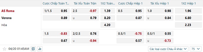 Bảng tỷ lệ kèo nhà cái Roma vs Verona