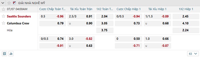 Bảng tỷ lệ kèo bóng đá Seattle Sounders vs Columbus Crew