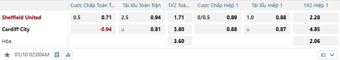 Bảng tỷ lệ kèo bóng đá Sheffield Utd vs Cardiff City