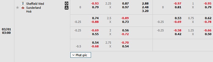 Bảng tỷ lệ kèo bóng đá Sheffield Wed vs Sunderland