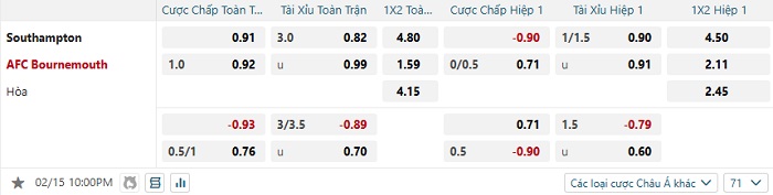 Bảng tỷ lệ kèo bóng đá Southampton vs Bournemouth