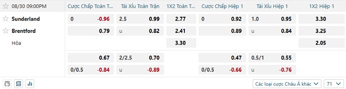 Bảng tỷ lệ kèo nhà cái Sunderland vs Brentford