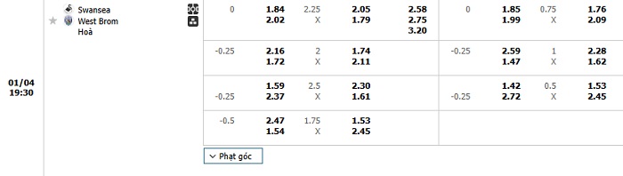 Bảng tỷ lệ kèo bóng đá Swansea City vs West Brom