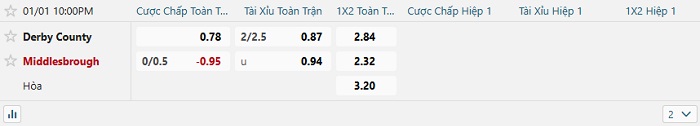 - Dự đoán tỷ số hiệp 1: Derby County 0 – 0 Middlesbrough