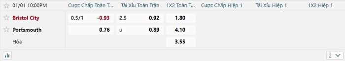 Tip kèo Châu Á full trận Bristol vs Portsmouth