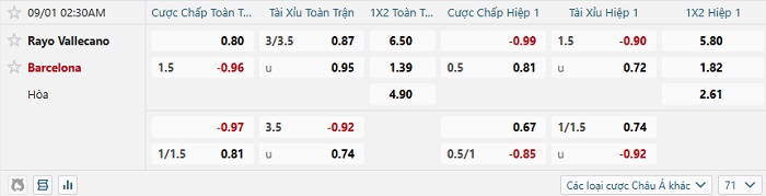 Tip kèo Châu Á hiệp 1 Vallecano vs Barcelona