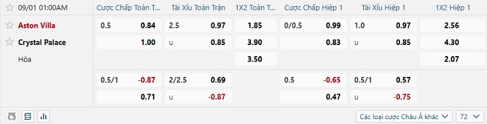Tip kèo Châu Á hiệp 1 Aston Villa vs Crystal Palace