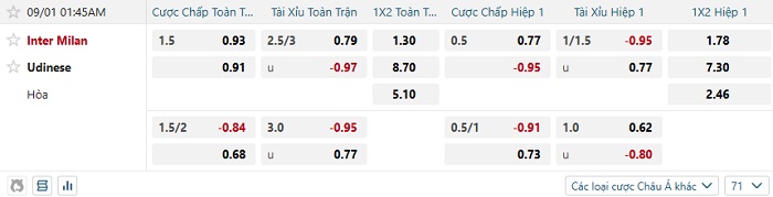 Tip kèo Châu Á hiệp 1 Inter vs Udinese