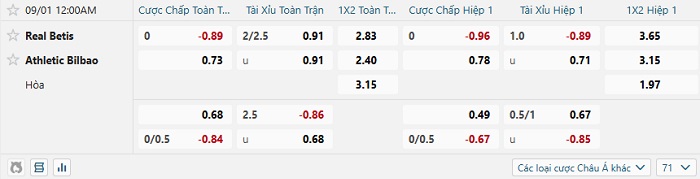 Tip kèo Châu Á hiệp 1 Betis vs Bilbao