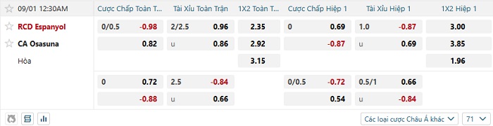 Tip kèo Châu Á hiệp 1 Espanyol vs Osasuna