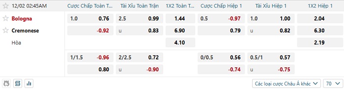 Tip kèo Châu Á full trận Bologna vs Cremonese