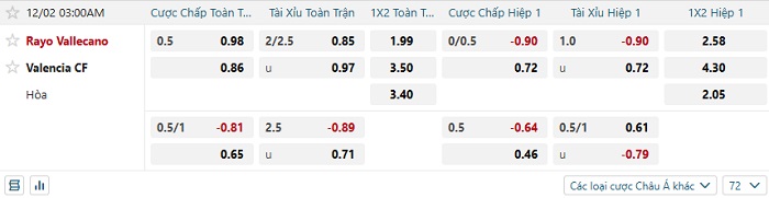 Tip kèo Châu Á full trận Rayo Vallecano vs Valencia