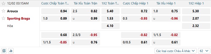 Tip kèo Châu Á full trận Arouca vs Sporting Braga