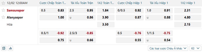 Tip kèo Châu Á hiệp 1 Samsunspor vs Alanyaspor