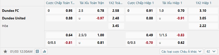 • Tip kèo cá cược Châu Á hiệp 1: Chọn Dundee FC +1/4