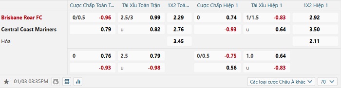 Tip kèo Châu Á hiệp 1 Brisbane Roar vs Central Coast