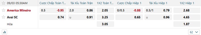 Tip kèo Châu Á hiệp 1 America Mineiro vs Avai SC