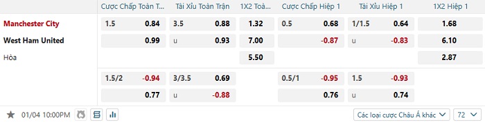 Tip kèo Châu Á full trận Man City vs West Ham