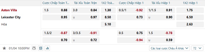 Tip kèo Châu Á full trận Aston Villa vs Leicester