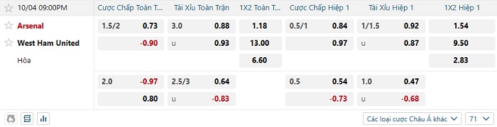 Tip kèo Châu Á full trận Arsenal vs West Ham