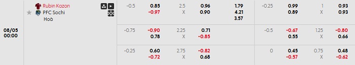 Tip kèo Châu Á full trận Rubin Kazan vs PFC Sochi
