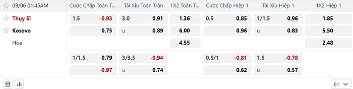 Tip kèo Châu Á hiệp 1 Thụy Sỹ vs Kosovo