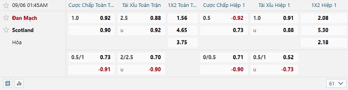 Tip kèo Châu Á full trận Đan Mạch vs Scotland