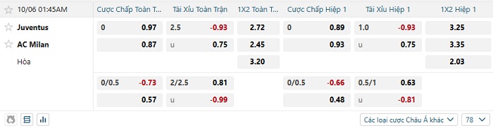 Tip kèo Châu Á hiệp 1 Juventus vs AC Milan