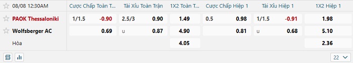 Tip kèo Châu Á full trận PAOK vs Wolfsberger