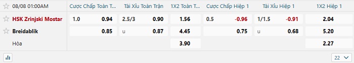 Tip kèo Châu Á hiệp 1 Zrinjski Mostar vs Breidablik