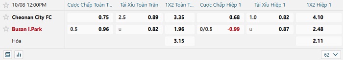 Tip kèo Châu Á hiệp 1 Cheonan City vs Busan I. Park
