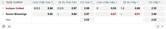 - Dự đoán tỷ số hiệp 1: Incheon United 0 – 0 Suwon Bluewings