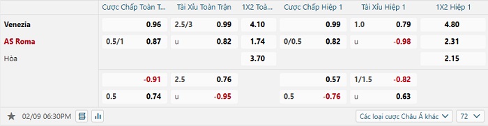 Tip kèo Châu Á hiệp 1 Venezia vs Roma