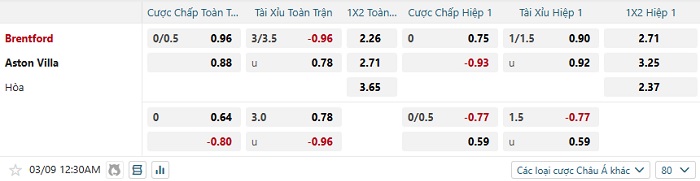 Tip kèo Châu Á hiệp 1 Brentford vs Aston Villa