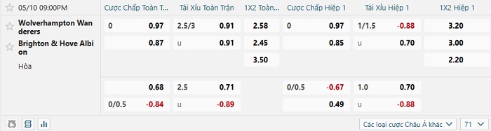 Tip kèo Châu Á full trận Wolves vs Brighton