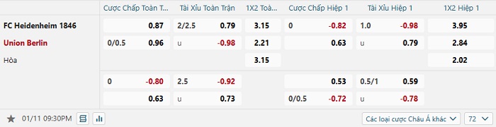 Tip kèo Châu Á hiệp 1 Heidenheim vs Union Berlin