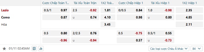 Tip kèo Châu Á hiệp 1 Lazio vs Como