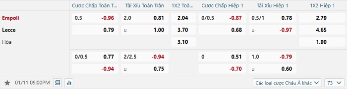 Tip kèo Châu Á hiệp 1 Empoli vs Lecce