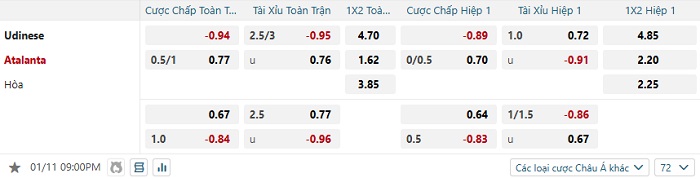 Tip kèo Châu Á hiệp 1 Udinese vs Atalanta