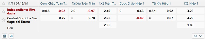 Tip kèo Châu Á hiệp 1 Rivadavia vs Central Cordoba