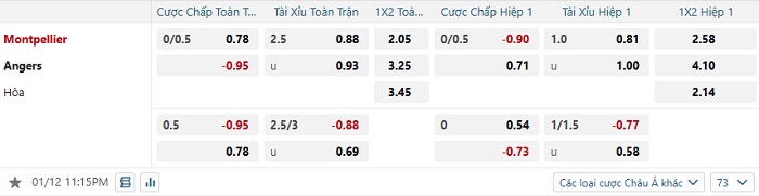 - Dự đoán tỷ số hiệp 1: Montpellier 0 – 0 Angers