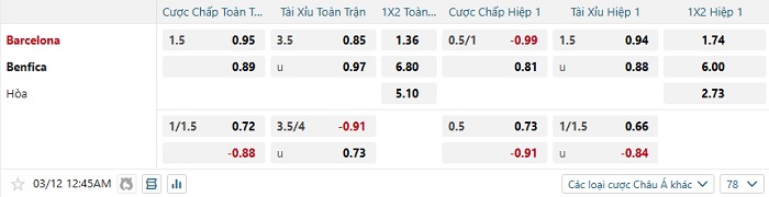 Tip kèo Châu Á full trận Barcelona vs Benfica