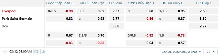 Tip kèo Châu Á full trận Liverpool vs PSG
