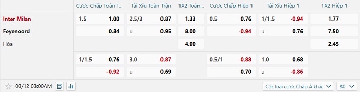 Tip kèo Châu Á hiệp 1 Inter vs Feyenoord