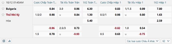 Tip kèo Châu Á full trận Bulgaria vs Thổ Nhĩ Kỳ