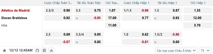 Tip kèo Châu Á full trận Atletico Madrid vs Slovan