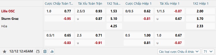Tip kèo Châu Á hiệp 1 Lille vs Sturm Graz
