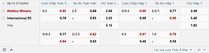 Tip kèo Châu Á hiệp 1 Atletico Mineiro vs Internacional