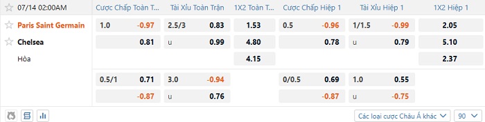 Tip kèo Châu Á full trận PSG vs Chelsea