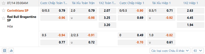 Tip kèo Châu Á full trận Corinthians vs Bragantino